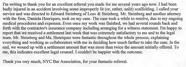 I had a great experience with this law firm for my personal injury case. I was referred to them by another attorney who did not handle the type of case I had and from the beginning I felt I was in good hands by Edward Averbach, Esq., Edward Steinberg, Esq. and the paralegals that worked my case. They were always professional, knowledgeable and just really nice people. I was fortunate enough to have my case settle and not have to go to trial. It settled for a lot more than I thought it would. I paid zero dollars the entire duration of my case and only paid fees at the end. Needless to say, I am thrilled with the outcome of my case and would highly recommend this firm to all of my family and friends for any personal injury cases they may have. Five stars for Leav and Steinberg – all the way!!