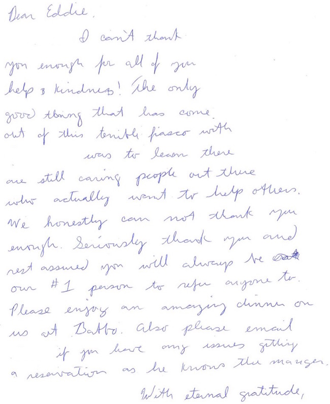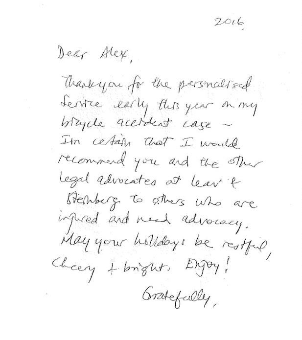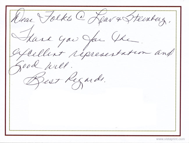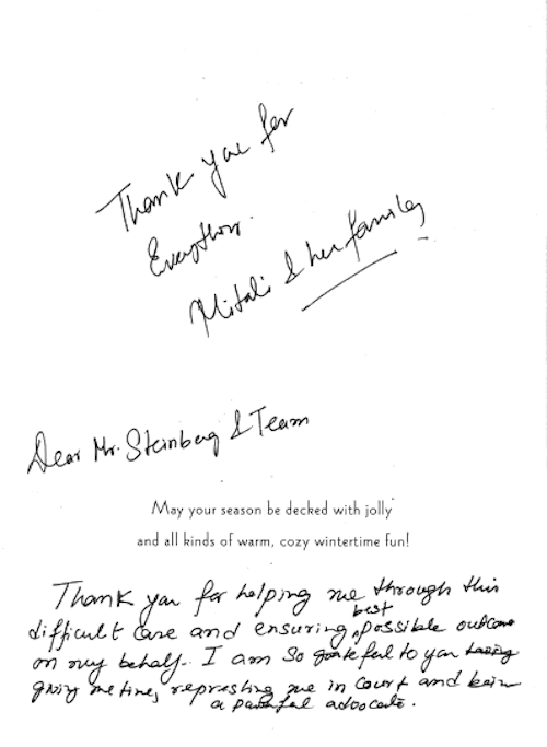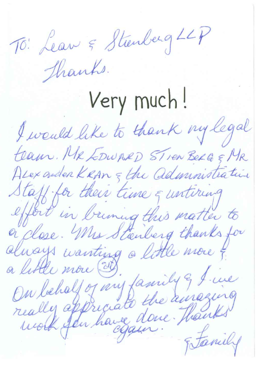 At Leav & Steinberg LLP, our personal injury attorneys strive to build a deep, personal relationship with everyone we take on as a client. At the conclusion of a case, we often receive words of thanks from the people we’ve helped exercise their legal rights. However, we recently got a handwritten thank you from Carol Argamaso, a client whose case hasn’t been completed.