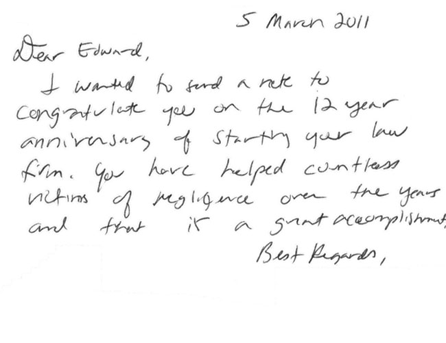 I just wanted to thank you for all of your hard work in handling my case. I am so grateful for everything you and Megan did. I am very pleased with the outcome. Ed did an amazing job at my mediation yesterday. I will be recommending anyone that comes my way to your firm.
